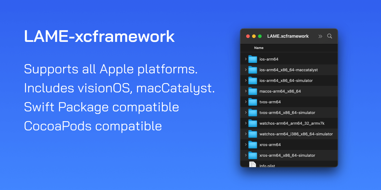 | LAME.xcframework | Build with | macOS | iOS | tvOS | watchOS | visionOS |