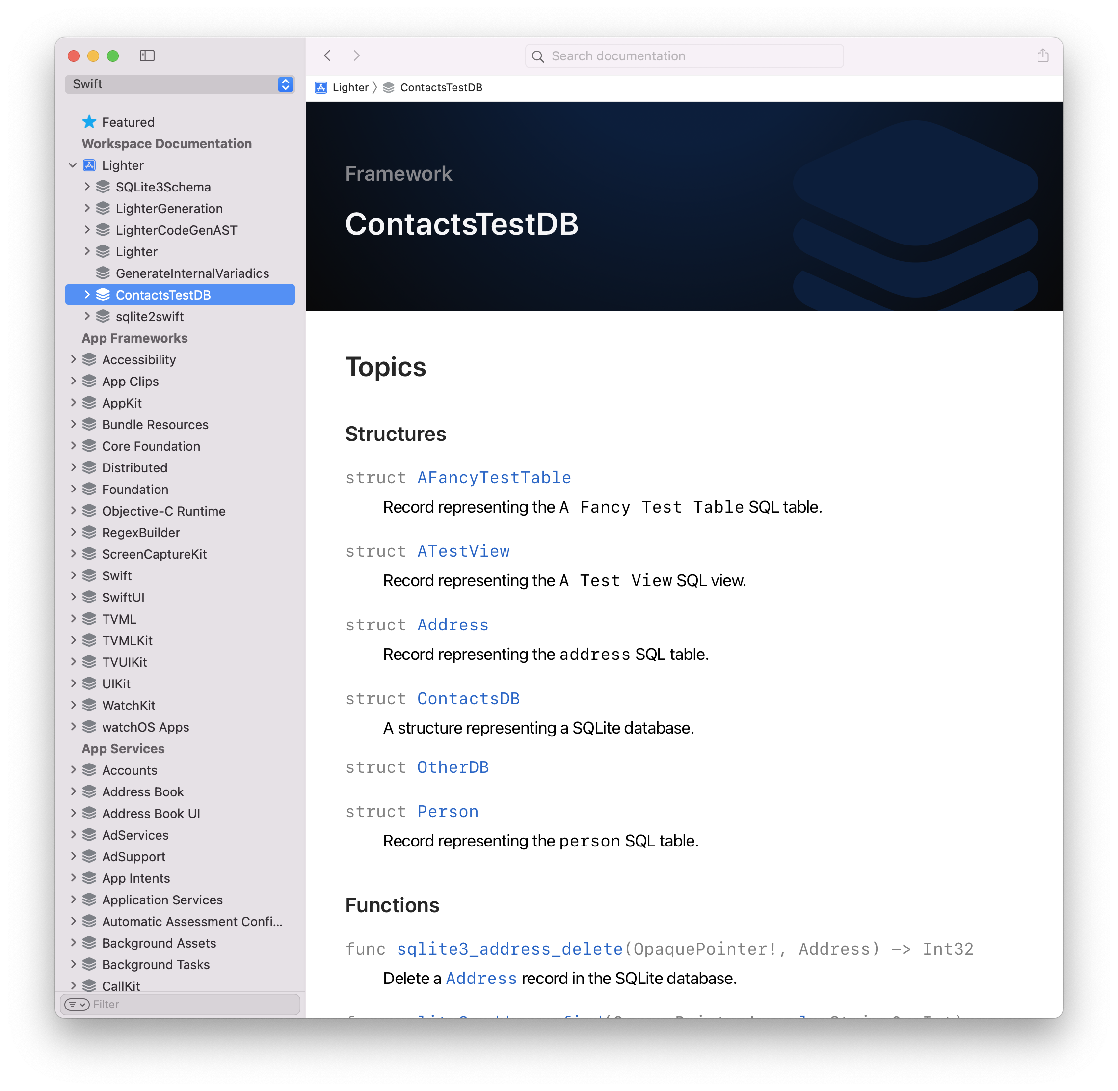 The toolkit is also useful for cases in which the extra dependency on Lighter is not desirable. For such the generator can produce database specific Swift APIs that work alongside the regular SQLite API.