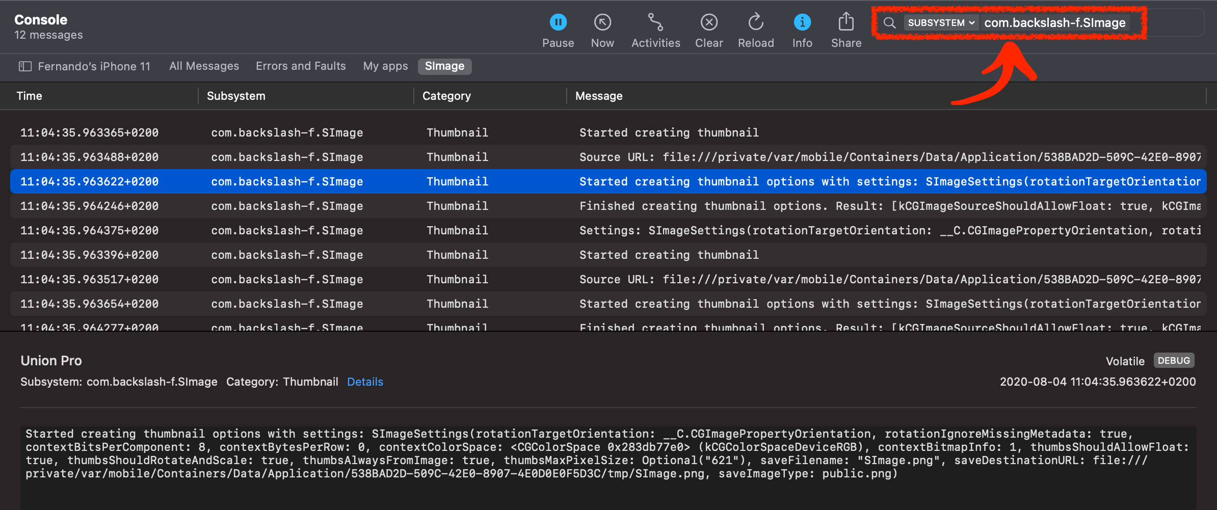 simage.disableLogging()In the macOS Console app, you can filter SImage output by SUBSYSTEM: com.backslash-f.SImage: