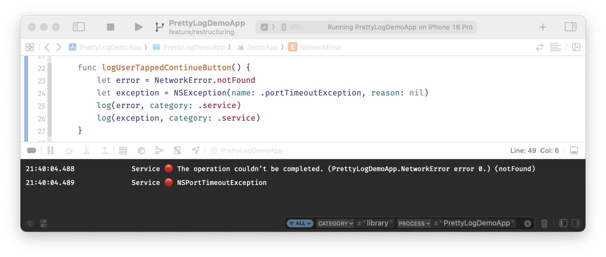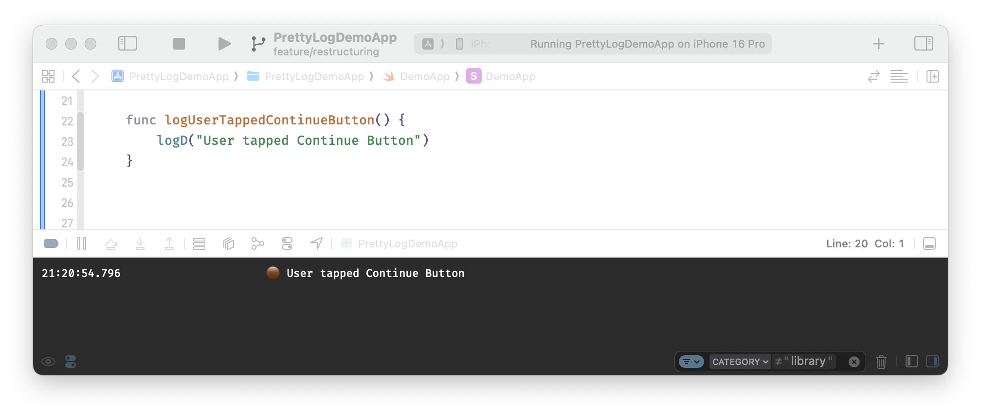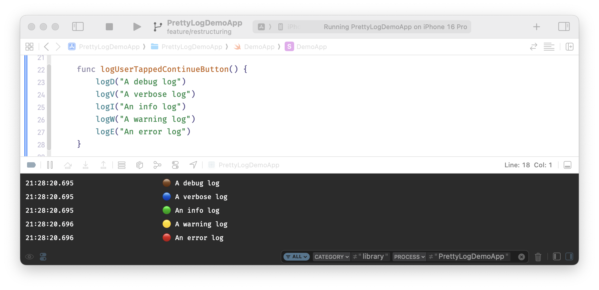 PrettyLog is a small Swift Package that makes logging in the Xcode Console a little bit more beautiful.