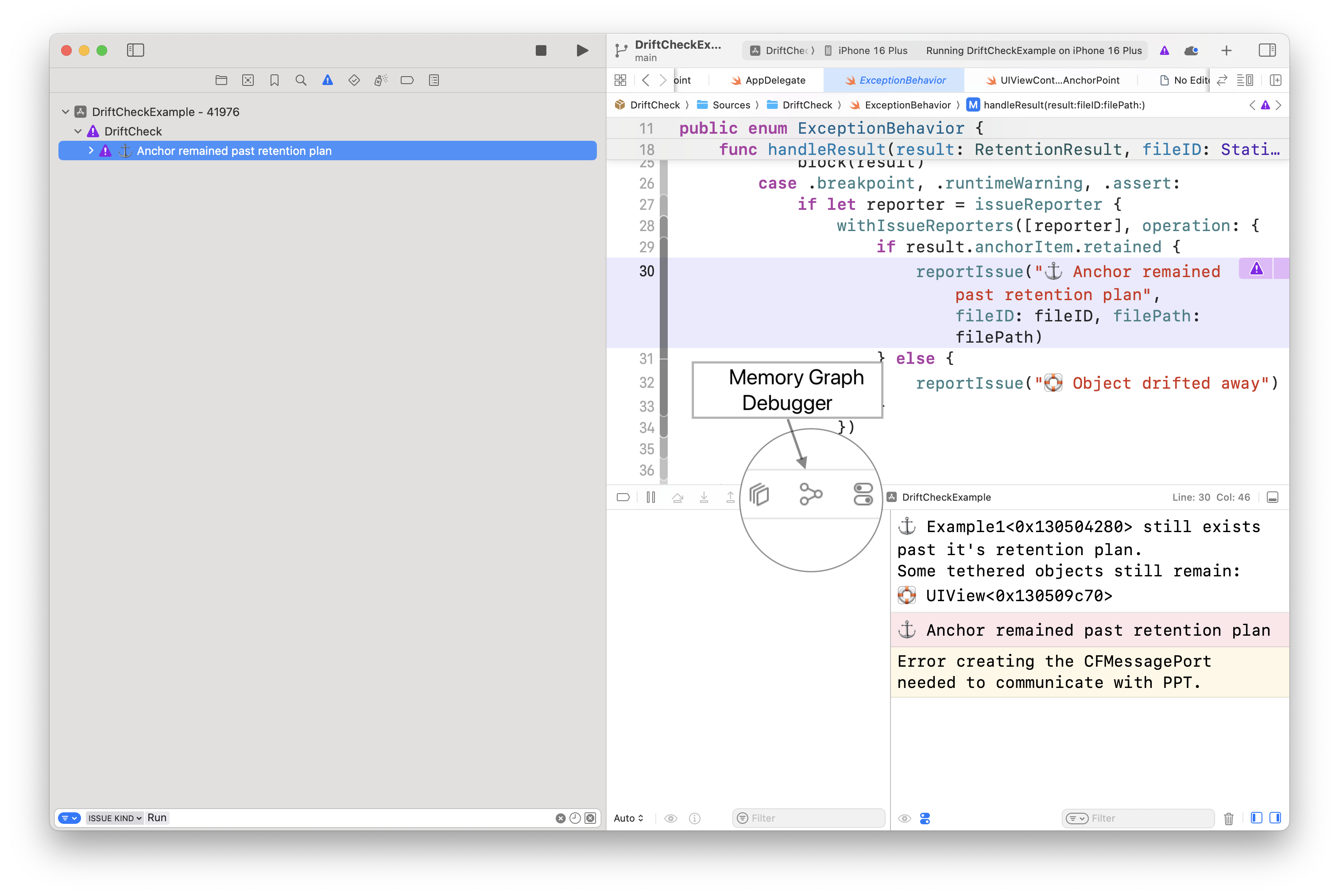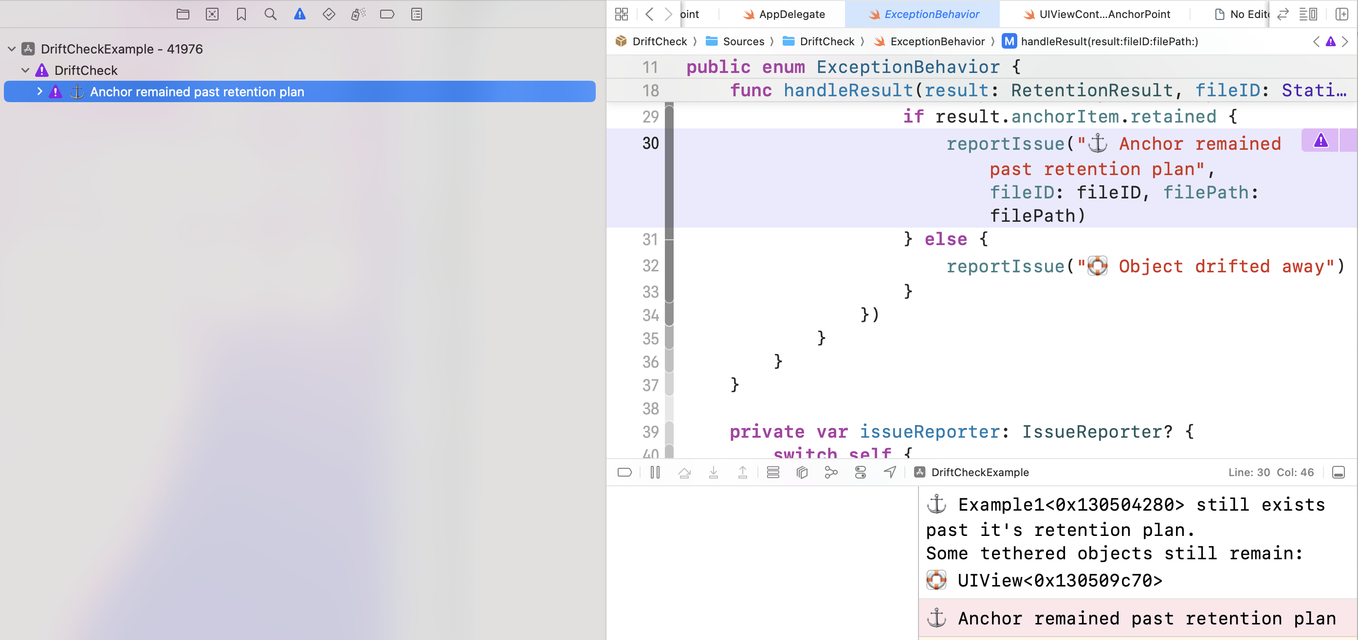 When an Anchor is removed from the view hierarchy, DriftCheck automatically verifies that both the Anchor itself and any tethered objects have been deallocated.