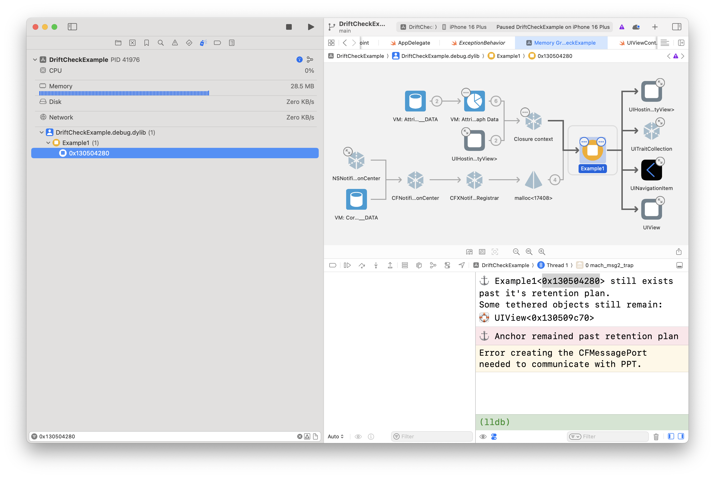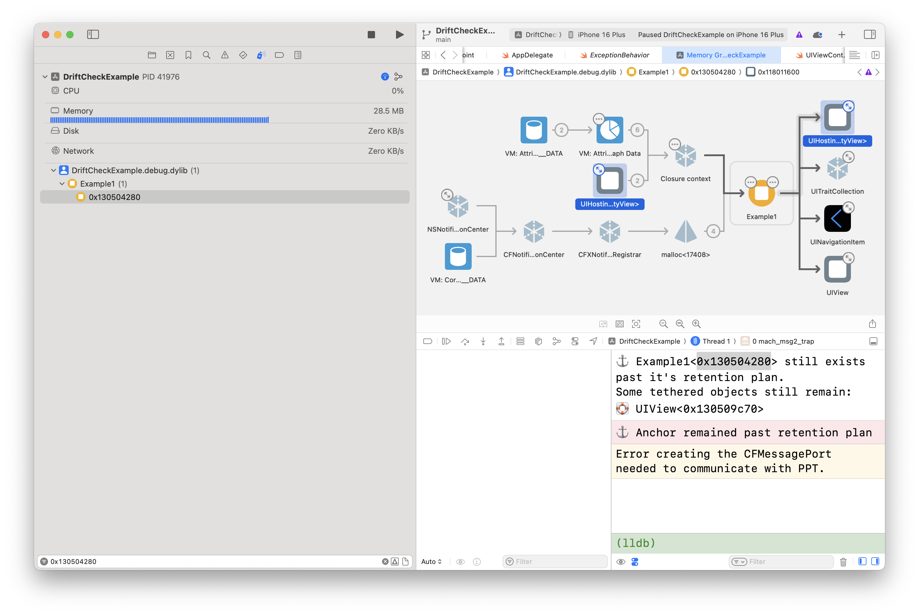 }Now when you run the app, open Example1, and dismiss it, DriftCheck will no longer report a leak. 🎊