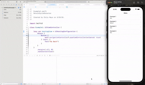 }The issue: The Button action within the hosting view strongly captures self, preventing Example1 from being deallocated.