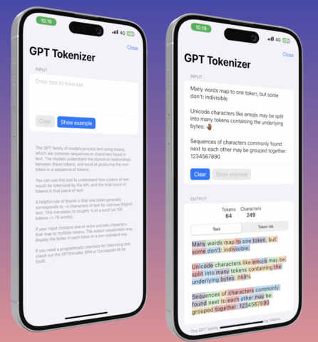 I've also created GPTTokenizerUI, a SPM lib you can integrate in your app for providing GUI to input text and show the tokenization results used by GPT API.