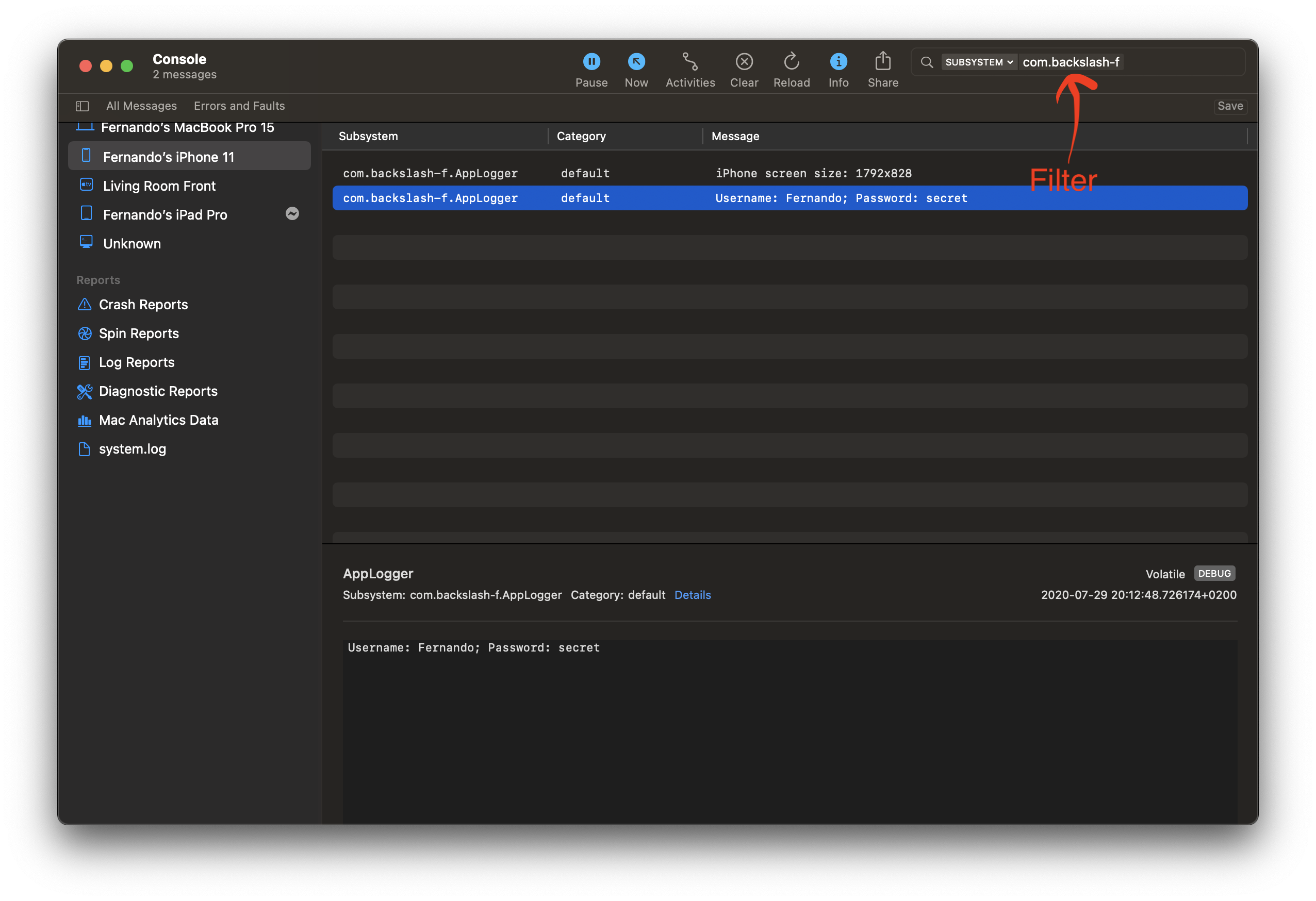 logger.log("Username: \(username); Password: \(password)", isPrivate: true)